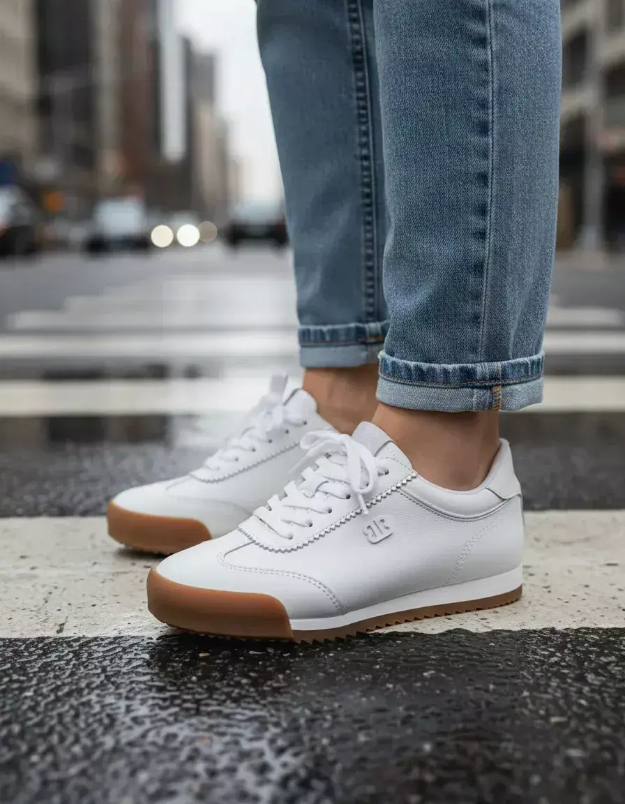 O destaque deste tênis fica por conta do elegante detalhe em couro prata no traseiro, que adiciona um toque moderno e diferenciado ao design clássico. A sola marrom, além de trazer um contraste estiloso, é feita para proporcionar estabilidade e resistência, ideal para quem busca um calçado versátil e funcional.
